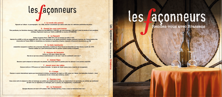 Dans sa jolie pochette cartonnée, il contient les chansons de Brassens arrangées à la sauce "Façonneurs" que nous chantons lors du spectacle "Rendez-vous avec Brassens".